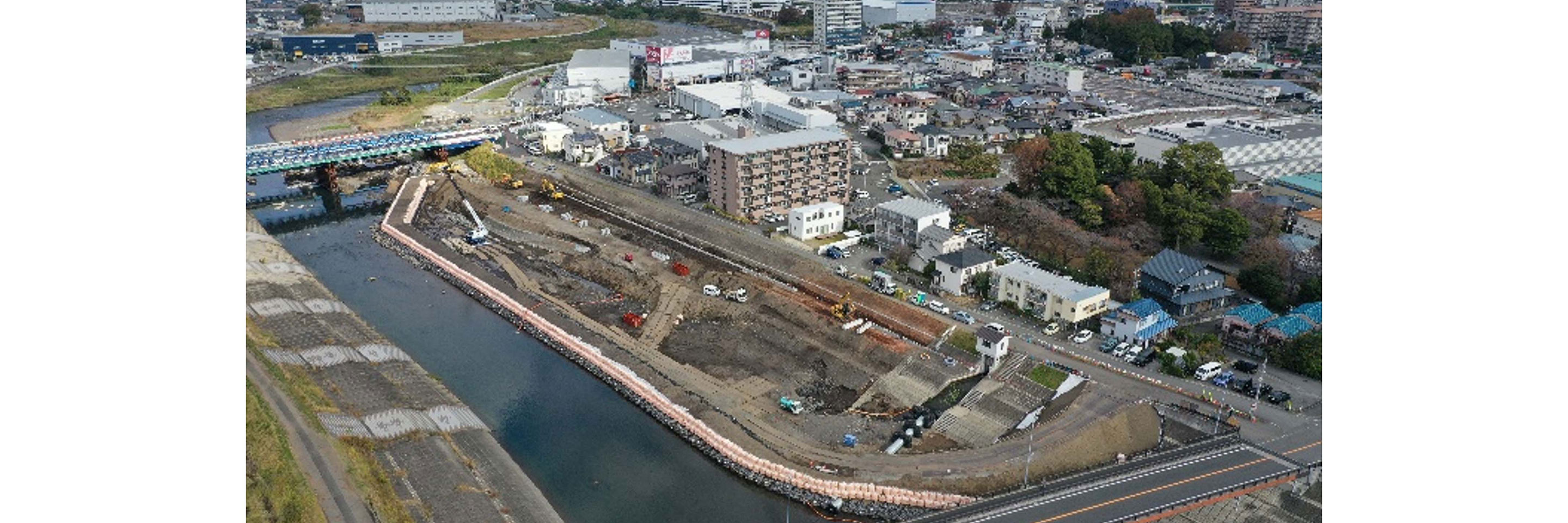 【施工数量】土量:掘削/運搬 11,400m³ 法覆護岸 3,274m² 工事用道路 10,500m³ 締切盛土 8,720m³