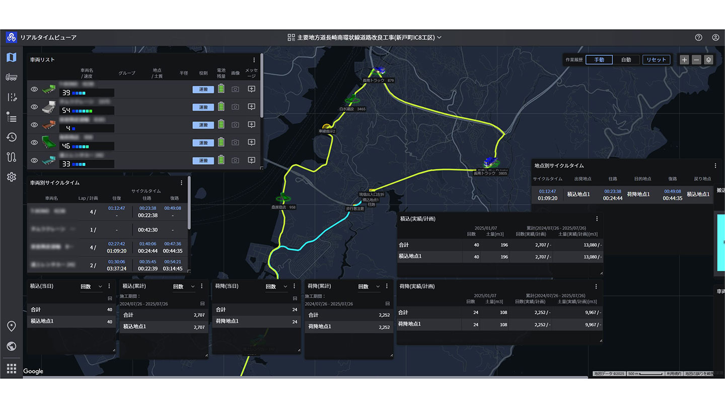 当社はこれまでにもSmart Construction Fleetを導入した経験があり、常にリアルタイムで運行管理できる点に魅力を感じていました。今回の現場は掘削メインの工事で、隣接工区と合わせると多い時で30台ほどのダンプが運行します。残土を搬出する土捨て場までの道のりにダンプ同士でのすれ違いが困難な狭所があり、もし対向車がきた場合には両車両がバックで下がり続けなければなりませんでした。そこで、狭所での交錯を未然防止するのと、往路12km、復路21kmという長い運搬距離での苦情を未然防止する目的も含めて、Smart Construction Fleetのリピート導入を決めました。