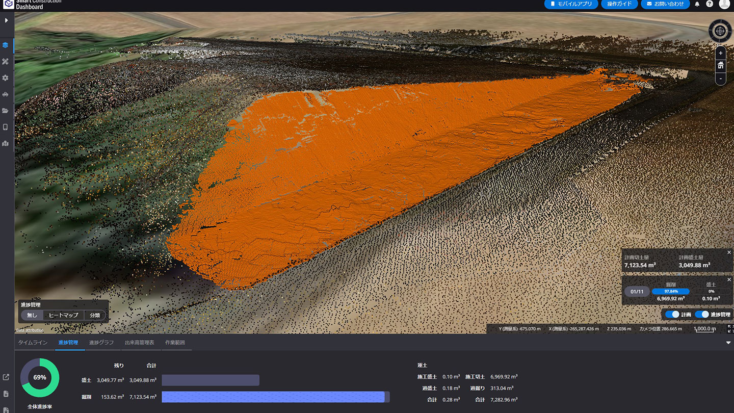 今回の現場は工期に余裕がなかったのですが、どこまで掘削すれば予算内の土量で施工できるのか、発注者との打合わせが必要でした。設計が決まらないと施工に着手できませんが、自社で3次元設計データ作成ソフトなども持っていないため、素早く土量算出できる方法がないか担当営業に相談しました。Smart Construction Design3Dであれば簡単な操作で3次元地形データ上に仮設設計を作図でき、概算数量を算出できるという話を聞き試してみることにしました。また日々の施工進捗を管理するために、PC200マシンガイダンス装着機の施工履歴データが反映するSmart Construction Dashboardも導入しました。
