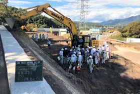 「ICT建機のおかげで人件費も工数も削減出来たよ。」と現場代理人の木暮さんは笑顔で話した。今回の現場は上信自動車道、群馬県から長野県をつなぐ地域高規格道路で、地域活性化や安全確保などの効果が見込まれている道路だそうだ。ICT建機の感想を現場技術員の石井健太さんに聞いた。「従来と比べて、掘削箇所の確認のための建機の乗り降りが減ったので、楽になりました。工程の確認もICT建機のモニタが設計データを表示しているから監督の指示を待たなくても進められました。全体的に工数が減り、作業が捗りました。」と話した。担当営業から感想を聞いた。「こちらの現場は地域でもいち早くICT建機を取り入れた為、周囲からの注目も高く、ICT工事セミナーも現場で開催し、関係者や地元の高校生に大好評でした。セミナーを体感した若い子たちの輝く目から未来の建設業会は明るいと感じました。」と笑顔で教えてくれた。