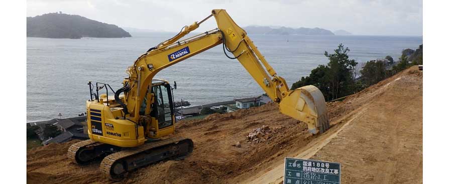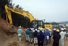 「一番のメリットは現場の安全性が向上したことだね。」と話すのは、現場代理人の玉井慎太郎さん。詳しく聞くと、「ICT建機を導入したことで、従来施工で必要だった丁張設置作業が無くなり、建機と人が接触する可能性が低くなり、労働災害の確率が大きく下がりました。」と教えてくれた。杉村所長は、「従来は、今回の現場のような急勾配の作業は経験を積んだオペレータでなければ出来ませんでした。急勾配で手元作業員がいると、危険予知が大切で、経験と勘が大事になりますからね。」と話した。洋林建設(株)様は山口県で最初のICT活用工事という事で、現場見学会を開催し、発注者や地域の関係会社にi-Constructionの5つのプロセスをわかりやすく説明していた。