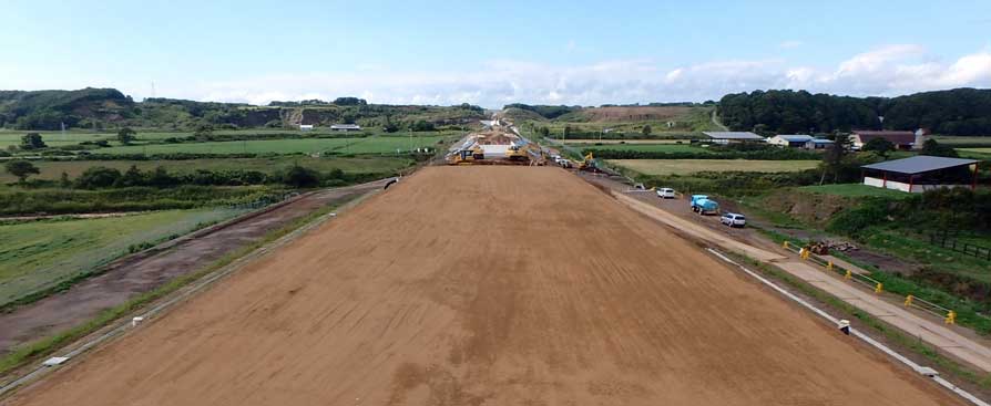 今回の現場は、北海道沙流郡(さるぐん)日高町を通る日高自動車道の建設工事。苫小牧市と浦河町を結ぶ総延長約120キロメートルの高規格幹線道路の一部を開通させる工事だそうだ。施工するのは苫小牧市に拠点を置く(株)小金澤組様。工事主任の原田嗣大さんに導入の経緯を聞いた。「建設業界のICT化が進む中、弊社でも導入を検討しておりました。そんな時、平成28年に発生した台風で北海道は大きな被害を受け、緊急を要する復旧工事の施工に追われ、必要な工事に対して、作業員に余裕が無い状況が続いていました。今回の現場は、初めてのICT活用工事で戸惑いや不安がありましたが、ICT技術で少しでも工数削減や工期短縮し作業員不足の解消に繋がれば良いと考え、決断しました。」と話した。