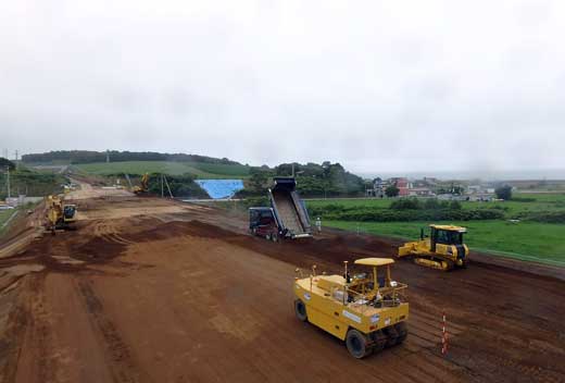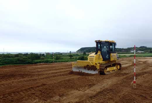 工事主任の澁木慎さんに導入した感想を聞いた。「D37PXiを導入したことで、設計通りに仕上がりました。本当に丁張が無くても施工ができる事に確信が持てましたよ。経験が浅いオペレータでも指導をしっかり受ければすぐに施工を任せられる建機ですね。」と教えてくれた。工事主任の原田さんは、「ICTブルドーザは走行の速度を上げてもしっかりと自動でブレード制御される、マシンコントロールの技術には驚きました。従来の盛土施工では丁張が設置されている事によって車両や重機が転回する場所の確保に苦労しましたが、丁張レスでどこにでも転回所を設置することが出来ましたし、実作業のほかに丁張を補修する時間も工程に組み入れていましたが、ICT建機では丁張レスで施工ができるので、その分、施工を早く進める事が出来ました。」と話した。