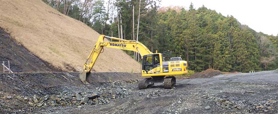 ■■導入効果■■ 髙山産業(株)土木部課長 末岡岳史さん ICT建機を今回の現場に導入したことにより、当初時間を要すると予想されていた丁張り作業が不要だった為、施工管理の負担が軽減され、スムーズに施工をすることが出来ました。運転席内のモニタで設計データが確認できるので、オペレータも機械から降りて進捗確認をする手間が少なくなり、作業効率の向上だけでなく、安全に作業をすることにも繋がりました。また、発注時の設計図面とドローン測量での現況図に差異が生じたのですが、スマートコンストラクションアプリを利用することで正確な土量が把握出来ました。施工途中の設計変更によるデータ変更の際は、スマートコンストラクションサポートセンタによる遠隔操作で、とてもスピーディーに対応して頂けたので、大変満足した施工となりました。今後は岩盤層でもICT施工が実現されることに期待しています。