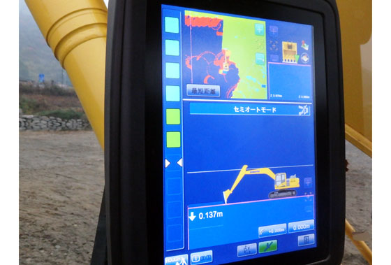 ■■導入効果■■ (有)角川建設 主任 小田真人さん 初めて導入したICT建機ですが、まず感じたのは施工と管理が楽ということでした。キャビン内のモニタを見ながら作業をすることで掘削場所や深さが把握でき、補助作業員いらずでオペレータ1人での施工が可能になりました。また、河川の工事では、施工前に土量計算書の提出が必要となりますが、ドローンとレーザースキャナを使用した3次元測量で取得した現況の3次元データと、設計図面で作成する3次元設計データを、スマートコンストラクションアプリにアップロードすることにより、立体的3Dビューワーとして自動生成され、簡単に土量計算を提出することが出来ました。出来形測量の前に予期せぬ大雨が降り、水位が上昇して施工面が隠れてしまうという問題が発生しましたが、水中部の施工履歴データを活用することで、急いで計測作業をする必要もなく、初めてのICT施工を安全で質の高い施工で実現することが出来ました。