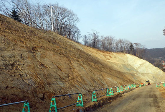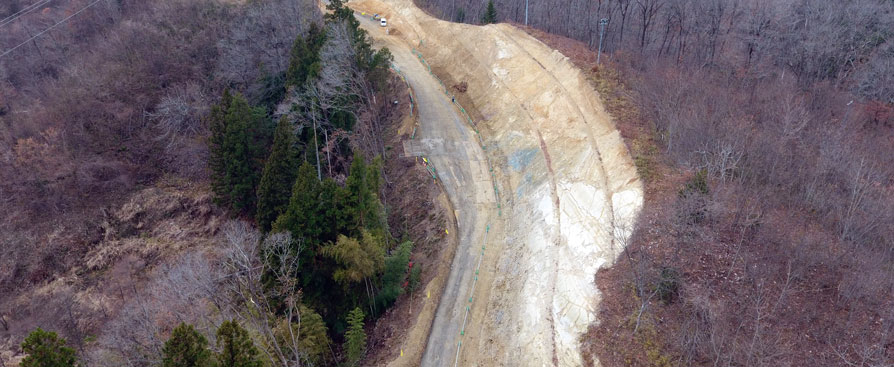 ■■導入効果■■ (株)深松組 工事長 相澤達哉さん 今回の現場は、法面が4段、高低差が18mもあることと、湾曲部も多く、従来の施工の場合、丁張りの設置にかなりの時間と労力がかかります。また、そのような環境で作業員が現場を測量をしたり丁張りを設置するのには、ケガや転落などの大きなリスクが伴います。ICT建機のマシンコントロールにより、設計面通りに施工することができるので、丁張りの設置が不要になり、その全てのリスクが軽減され、安心安全な現場を実感しました。 (株)深松組 大久保陸さん 従来だと10日かかっていた測量作業が、ドローン測量では1日で完了したことには驚きました。ICT建機で施工した箇所は、スマートコンストラクションアプリにデータが蓄積されるので、その測量データと比べることで、作業の進捗をリアルタイムに確認できて、効率よくスムーズに施工を進めることができました。