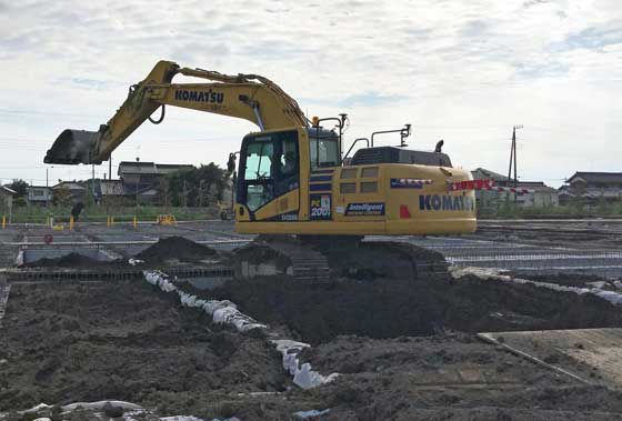■■現場詳細■■ 埼玉県 加須市 大型物流倉庫建設に伴う建築基礎工事 【現場範囲】敷地面積34,800m² 【施工土量】掘削25,600m³ 【ICT建機】PC200i ■■導入経緯■■ (株)ガイアート 作業所長 鉢呂朋彦さん 以前、コマツIoTセンタ 東京でのセミナで、建築現場でもICT建機が使えるという話を聞いてから興味を持っていました。今回の現場は施工期間や工程、土量がICT建機を試してみるのにちょうど良い規模だったことや、時代の流れに乗って、ICT建機を使っていかなければという思いもあったことから、導入を決定しました。初めての導入だったので、本当に工数を削減できるのか、どこまで精度が高いのかという不安もありましたが、建機で掘る前の墨出しの工程を省くことができれば、かなり楽になるだろうという期待もあり、半信半疑の導入となりました。