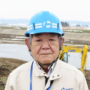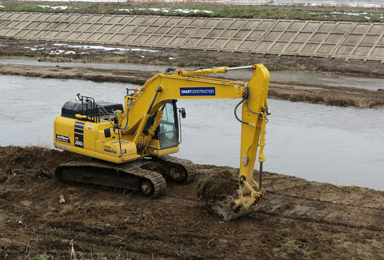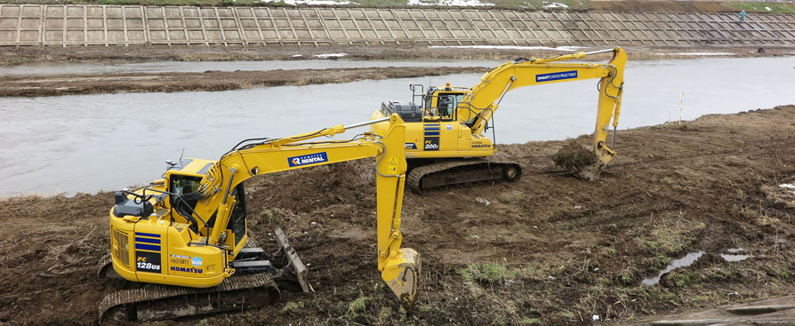 ■■現場詳細■■ 福島県会津坂下町 河道に溜まった土砂を掘削し、河川の氾濫を防ぐための工事。 【施工範囲】 延長350m/面積32,000m² 【施工土量】掘削7,400m³ 【ソリューション】 SMART CONSTRUCTION Retrofit ■■導入経緯■■ マルト建設(株) 執行役員 土木統括部長 赤城雅寛さん 当社では、スマートコンストラクション開始当初の2015年4月よりICT建機を積極的に活用しています。今回は、PC200iに加えてPC200iでは入れない狭い箇所にレトロフィットキット装着のPC128USを導入しました。PC128USiよりも安価で導入できることとPC128USi同様にスマートコンストラクションアプリで施工履歴が確認できることに魅力を感じました。進捗管理はドローンを活用できれば良かったのですが、積雪が多い地域のためドローンの活用ができない可能性が高かったため、ICT建機の施工履歴を活用しようと導入を決めました。