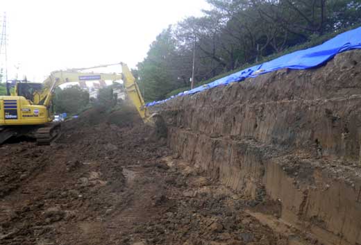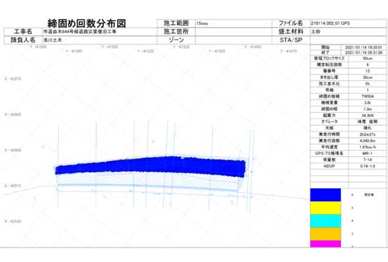 ■■現場詳細■■ 東京都 八王子市 2019年 台風19号の影響で地滑りが起こり、法面が崩壊したことにより通行止めとなった歩道の災害復旧工事。 【施工土量】盛土3,890m³ 切土4,440m³ 【ICT建機】PC128USi 転圧管理システム ■■導入経緯■■ (有)浅川土木 取締役 峰尾佳明さん ICT建機については、手元作業員や丁張り設置に関わる工数の削減が可能であり、熟練度の低いオペレータでも正確な作業ができるという点から、導入してみたいという気持ちが数年前からありました。しかし、これまでは導入コストに見合う土量のある現場が無く、導入を見送っていました。今回の現場は施工土量が比較的に多く、段切り掘削や盛土法面など、従来施工であれば多くの丁張りを必要とする施工内容を含んでいることから、ICT建機を導入する効果が大きいと判断し、導入を決定しました。
