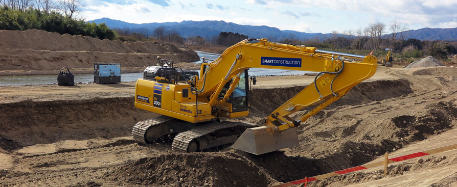 ■■現場詳細■■ 福島県双葉郡浪江町 2019年の台風19号で起きた洪水により、川のブロックが剥がれ流されてしまった箇所を修復する護岸工事 【施工延長】470m 【ICT建機】PC200i 【ソリューション】 SMART CONSTRUCTION Edge ■■導入経緯■■ (株)シイナ重建 東北支店 土木課 土木主任 加藤政美さん 元々、ICT建機は北海道の本社にて保有していました。丁張りが必要最低限で済み、作業工程が早く進むのでとても使い勝手が良く、あらゆる現場で活用しています。 今回の現場は、従来では川の中に人が入って丁張りの設置や高さを確認する作業が必要となるので、手間と工数がかかることと、リスクのある作業になることが心配でした。そこで、人手が少ない中、効率アップと安全性の確保のためにもICT建機の導入を決めました。