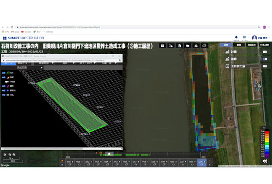 ■■導入効果■■ 草野作工(株) 現場代理人 近藤亮太さん 従来の河川工事では、増水したときに都度掘削箇所の高さを作業員がトータルステーションを使用して測量をしていました。ICT建機を導入したことでバケット刃先から位置情報の確認ができるため、今まで作業していた測量の手間が省けました。そのため作業員不足の解消や、熟練作業員ではなく若手作業員でも作業が可能になり、現場の施工性がアップしました。施工履歴データを使用するのが初めてだったので、本当に精度よく出来形が取れるのか?などの不安な気持ちもあり、念のためトータルステーションで実測してみると、思った以上の高精度に驚きました。この精度なら冬期間中も出来形管理ができると実感しました。また、スマートコンストラクションアプリでは、複数個所の現場に分け、進捗管理をしていましたが、日々の進捗をすぐに確認することができ、管理という面でメリットがあると思いましたので、今後更なる進化に期待しています。
