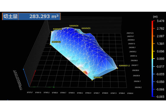 今回の現場では、ペイロードメータを2台導入しました。ダンプの積載量を最適化するために、積み込まれた土量を客観的に数字で確認できるので、過積載の防止に繋がり、発注者へアピールすることができました。また、過少積載を防止できたことで作業効率がUPし、CO2排出量の削減にも繋がりました。土量管理については、盛土部分が高くなったり、断面が複雑になったりすると、従来の測量方法では手間と工数のかかるリスクのある作業となりますが、ドローンを活用することで大幅に省力化でき、作業員が怪我をする心配もなくなりました。飛行経路の設定をした自動飛行のSMART CONSTRUCTION Droneを数分間飛ばした直後にSMART CONSTRUCTION Edgeで処理を開始すると、この現場では約10分で3次元点群データとオルソ画像が生成されて、こんな短時間でほぼ正確な土量が把握できるなんて驚きました。今後はICT建機も導入して、安全で効率の良い現場を作り上げていきたいと思います。