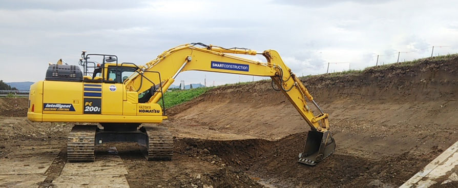 ■■導入効果■■ (株)保坂組 池田琢磨さん 今回はPC200iを使用して施工したのですが、法面掘削も丁張り設置なしで綺麗に仕上がるし、マシンコントロール機能によって重機の手元作業員がいなくても正確で安全な掘削作業ができて、作業日数の短縮にも繋がりました。自分の腕を信じていた熟練オペレータも、掘削作業終盤ではマシンガイダンスとマシンコントロールを上手く使い分けていて、PC200iの性能に感動していました。使ってみないとこの魅力は分からないと思うので、ぜひ使ってみてほしいです。また、トラブル発生時のサポートセンタの対応力や、スマートコンストラクションアプリで事務所のパソコンから施工状況や稼働状況の確認ができたことにも感動しました。建設業に従事してから25年、想像すらしていなかったような安全で正確な施工ができるなんて夢のようです。今後はさらにICT施工が当たり前になってくると思います。社内の体制づくりや若手オペレータの育成を進めていきたいと思います。
