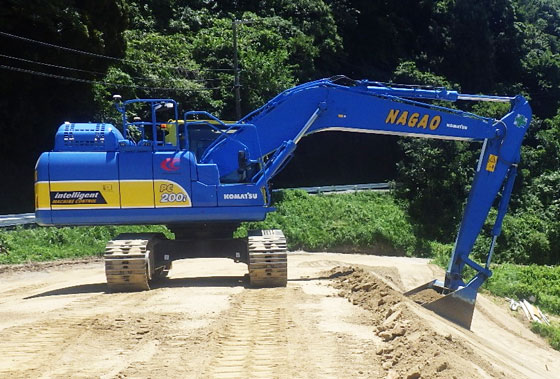 ■■導入効果■■ (株)長尾工業 現場代理人 田中敦史さん 今回の現場は設計データが複雑でしたが、ICT建機の導入で目印程度の丁張りだけで施工が可能となり工期の短縮へと繋がりました。すべての工程おいてはもちろんですが、特に法面整形部においてはデータが複雑であったにもかかわらず、3次元設計データ通りに仕上がりました。見た目も綺麗で作業時間も早く、法面整形時に勾配確認が建機内のモニタ画面でできるため、建機乗降時の工数も削減できました。盛土敷均し時においてもD37PXiを使うことで作業効率が向上し、1日当たりの盛土量が増加して工期の短縮に繋がりました。また、手元作業員も不要となり、建機と作業員の接触リスクを防ぐことができ、安全性も向上しました。今後もICT活用工事において積極的に取り組んでいきたいです。
