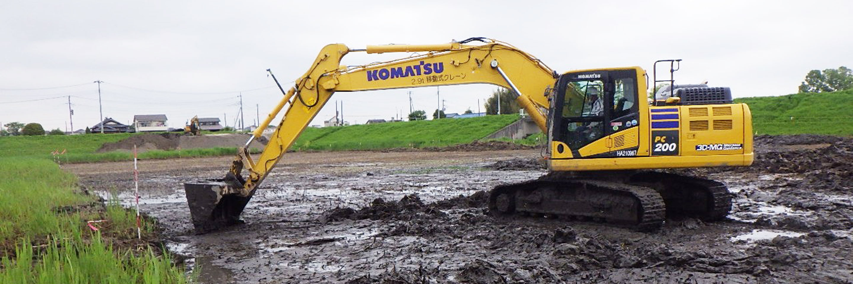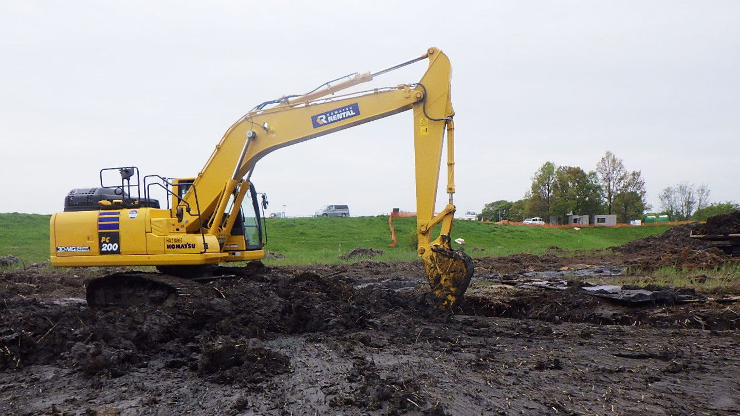 今回の工事は、調整池に堆積している土を撤去し水を貯める場所を確保するための工事で、発注者指定型のICT活用工事だったためマシンガイダンスの建機を導入することにしました。マシンコントロールではなくマシンガイダンスにした理由は、予算面で優しいというだけでなく、手動の部分を残して作業をしたいという思いがあったからです。会社としてICT活用工事の経験はあったものの、私としては初めてのICT活用工事だったため、マシンガイダンスの建機での施工を決めました。コマツに任せようと思った決め手は、価格の面だけでなく、施工内容の提案や必要資料の作成、i-Constructionの5つのプロセスへのサポート面が充実していたことです。オペレーターはICT建機の使用経験があったのですが、その経験に合わせ納入指導を行っていただけることもあり、コマツでICT活用工事に取り組むことを決めました。