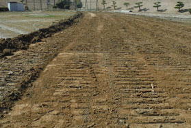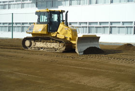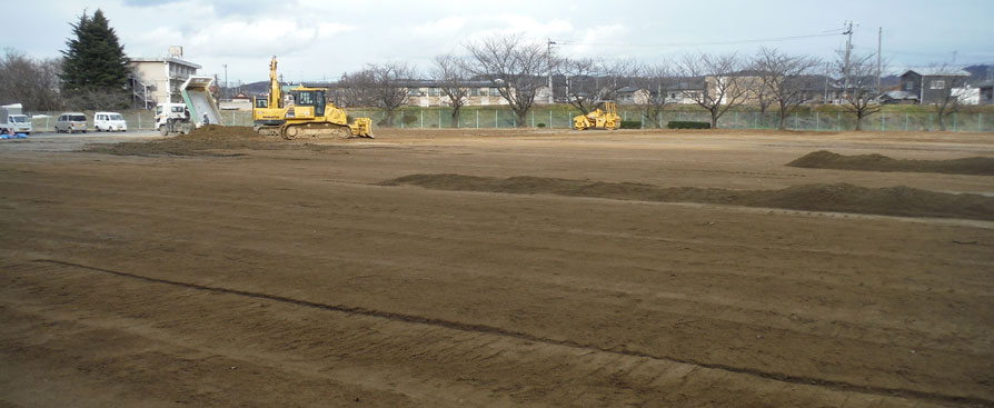 2011年3月11日に発生した東日本大震災の影響により福島県内ほぼ全域で除染作業が行われている。今回の現場はそのひとつ郡山市内にあるグラウンドの除染。芝を剥がして土を5㎝すき取り埋め戻す作業である。導入の経緯を(株)環境技研 工事部部長の渡辺勉さんに聞いた。「高い精度を求められる現場でした。ブルドーザのオペレータにはブランクがあり施工に不安を感じていましたが、以前より担当営業からの説明でICT建機には興味を持っていたので導入を決めました。」と話した。また「確実・簡単・綺麗を求めていました。」とも渡辺部長は教えてくれた。担当営業は、「ICT建機の導入初日、操作説明をしたすぐ後からオペレータが乗りこなす姿を見て、とても感動した。」と話した。
