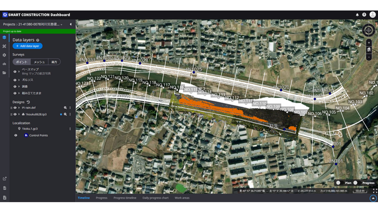 ■■ 現場詳細 ■■福島県いわき市平塩 加地和・渡辺特定建設工事共同企業体として、川の拡幅をする河道掘削工事 【施工範囲】右岸側 延長300m 【施工土量】60,000m³ 【ソリューション】Smart Construction Retrofit (掲載月:2022年11月)