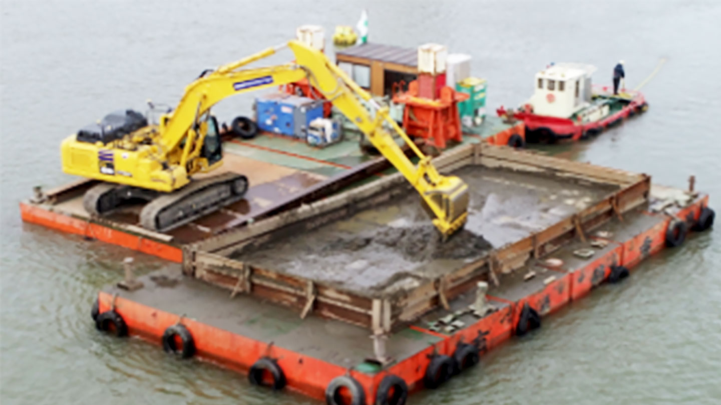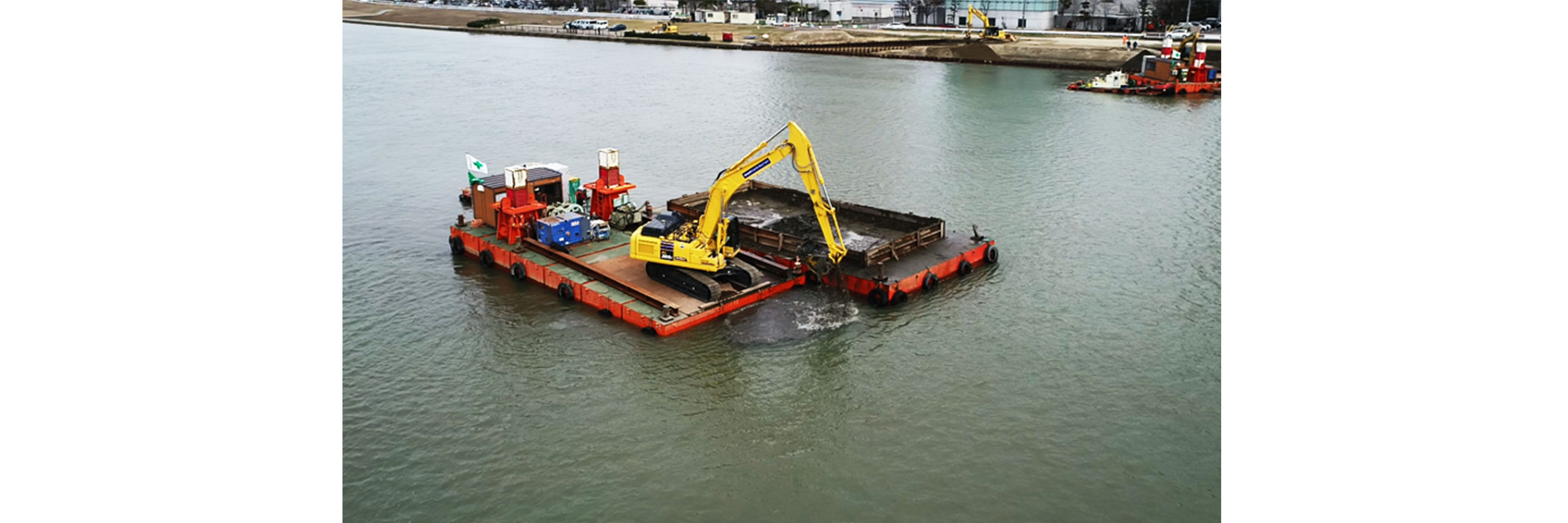 PC300iにエクステンションアームを装着したことで、作業船を停めた際の掘削作業半径に、積込み時の作業半径も広くなったので、1回の停船時の施工量が増えました。そのため土運搬船も大きくなり日当たり施工量も増加し、生産性も約4割向上することができました。