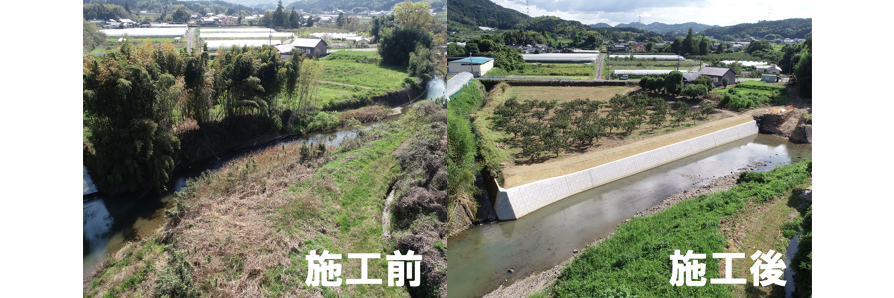 河川の氾濫を防ぐため川幅を広くしてブロック積みを施工する工事