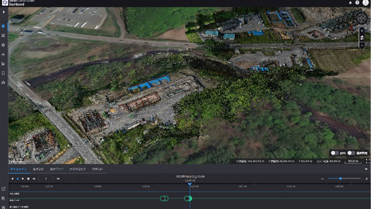 Smart Construction DashboardはWebブラウザ上で動作するため特別なソフトを必要とせず、現場で点群データを活用して関係者間でイメージを共有することができるため、従来だと複数回打ち合わせが必要になるところを1回で共有が可能になりました。面積や距離の計測、断面の切り出しが容易に行えるため、人の手による危険箇所の計測が可能となり安全の確保にもつながりました。また土量算出も可能なため、現況をドローンで測量することで広範囲の土量計測ができました。
