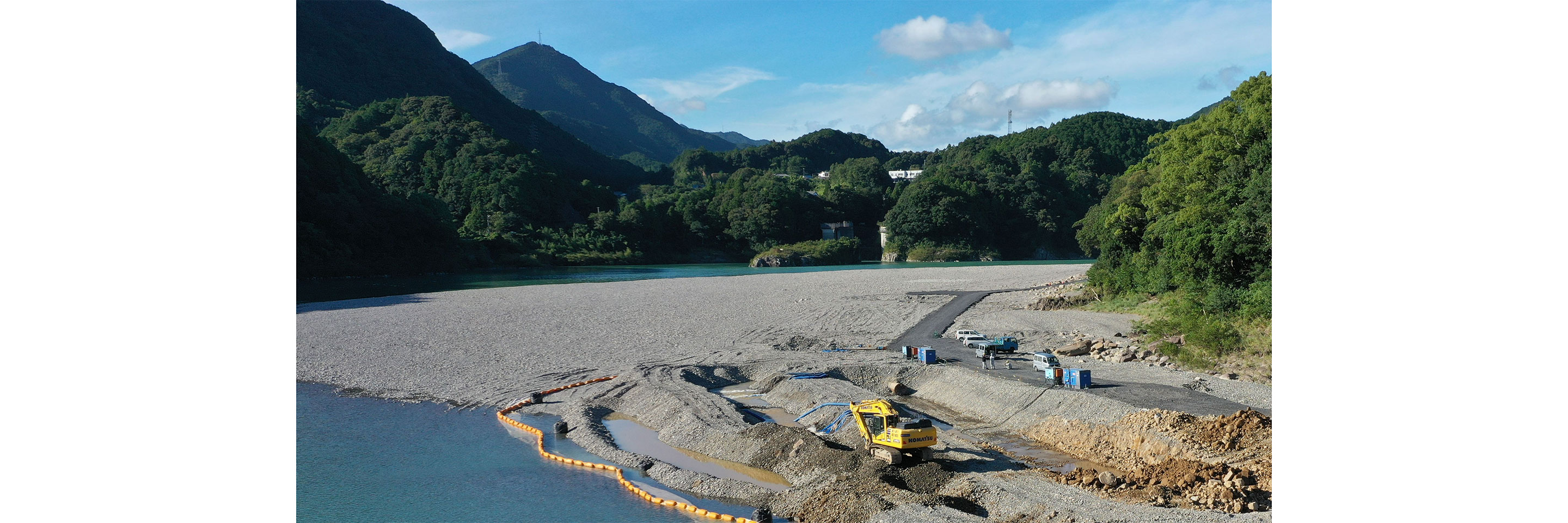 この現場は、下流にある取水施設を上流へ作り変える工事です。