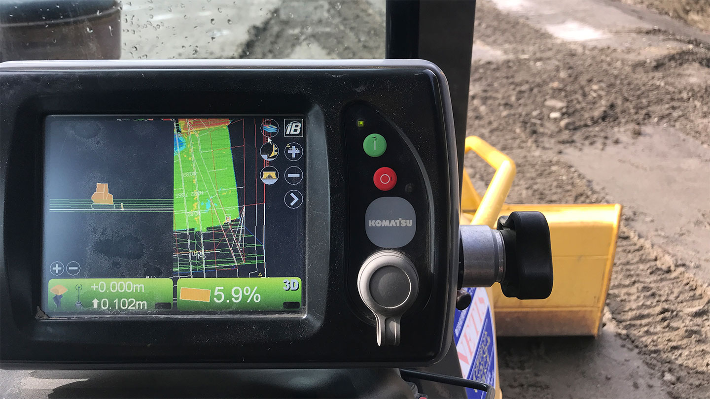コマツのICT建機は、建機のモニター上に設計データが表示されるため、完成形をイメージしながら施工することができましたし、建機のモニター上で設計データと作業機の高さを確認しながら施工できるため、丁張りを最小限に減らすことができました。それに伴い、丁張り設置作業も大幅に削減されました。施工後の検測作業も、刃先を施工箇所に当てて確認できるため、少ない人数でも施工を止めることが無く、とても感動しました。