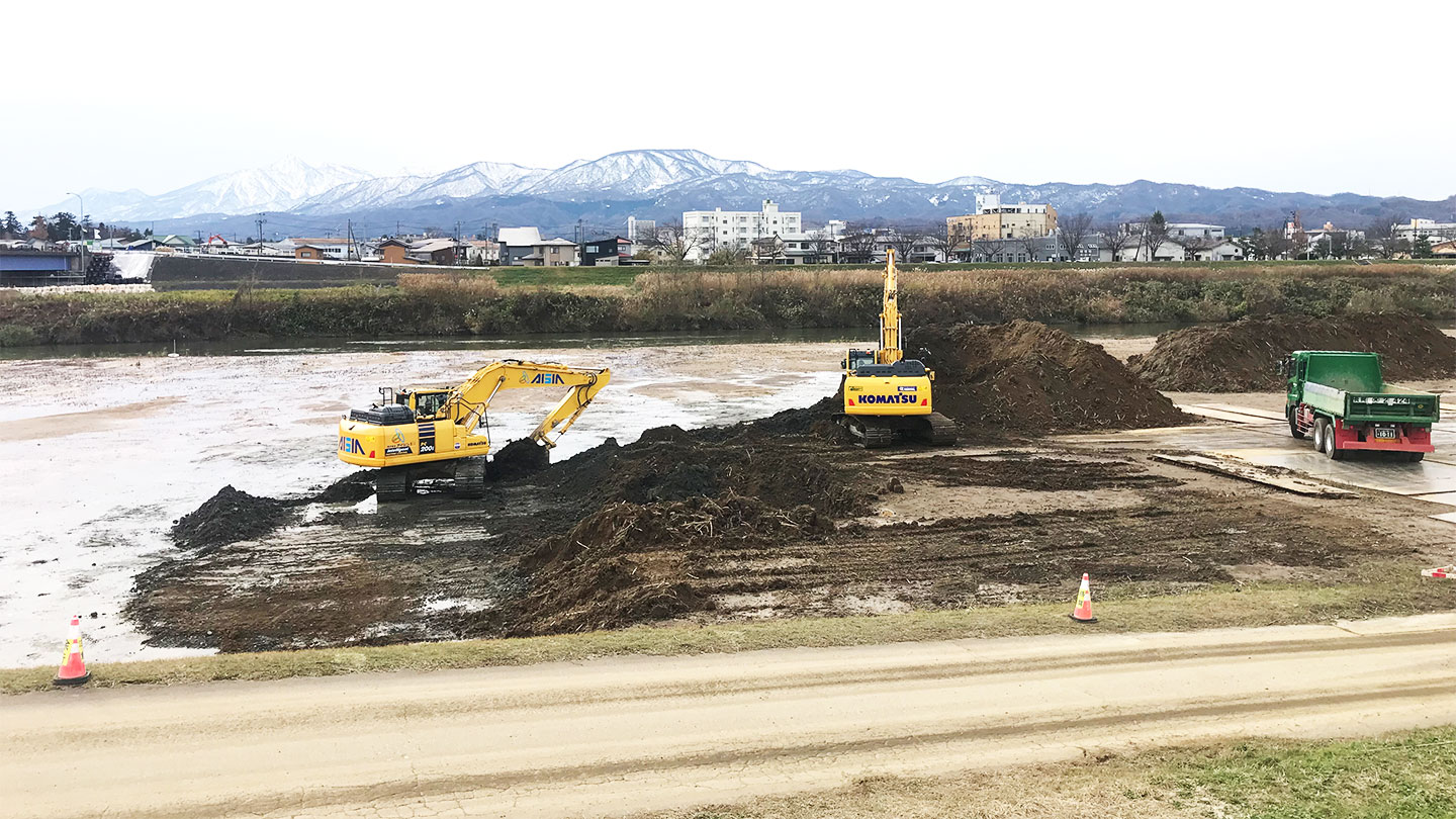 上越市内を流れる関川に堆積した土砂を撤去する国土強靭化対象工事