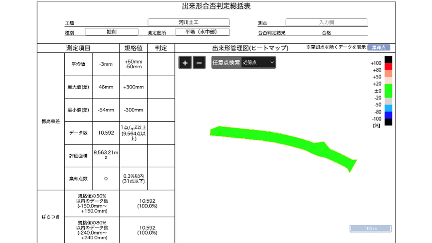 今回のような河川現場を従来施工で行った場合、丁張り設置作業に、設置をする人、高さを確認する人、丁張りを確認しながら繊細なレバー操作を行う経験のあるオペレーターと、3名から5名の作業員が必要と想定されます。今回は、PC200iとPC200マシンガイダンス装着機の2台を導入しました。両方とも3次元設計データを建機に転送しているためモニター上で目標面までのバケット刃先の位置情報が明確で、設計面までのバケットの位置情報を確認しながら施工ができるので、丁張りレスで、現場監督とオペレーター2名で終えることができました。オペレーターは経験が浅くても、驚くほど高い精度で施工することができましたし、丁張り設置の手間と手元作業員の削減で接触リスクの軽減、水際作業での安全性も高まりました。