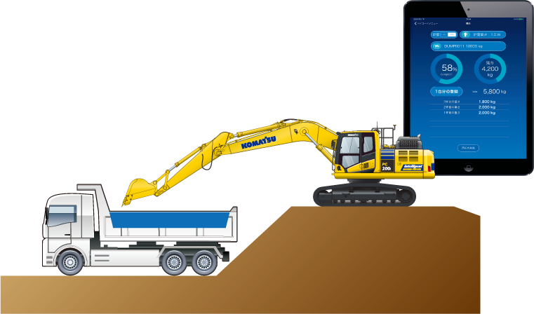 ペイロードメータは、バケットで積込む土の重量を計測してタブレットに表示させることができるPC200iの機能です。積込み作業時は、タブレットでリアルタイムの積載重量、積込可能総重量が確認できます。