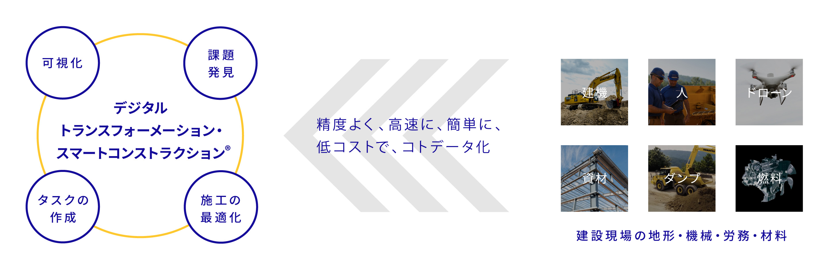 スマートコンストラクション®は、建設生産プロセス全体のあらゆるデータをICTで有機的につなぐことで、測量から検査まで現場のすべてを「見える化」し、安全で生産性の高いスマートな「未来の現場」を創造していくソリューションです。 労働力不足をはじめ安全性の向上など建設現場の様々な問題・課題を解決へと導きます。