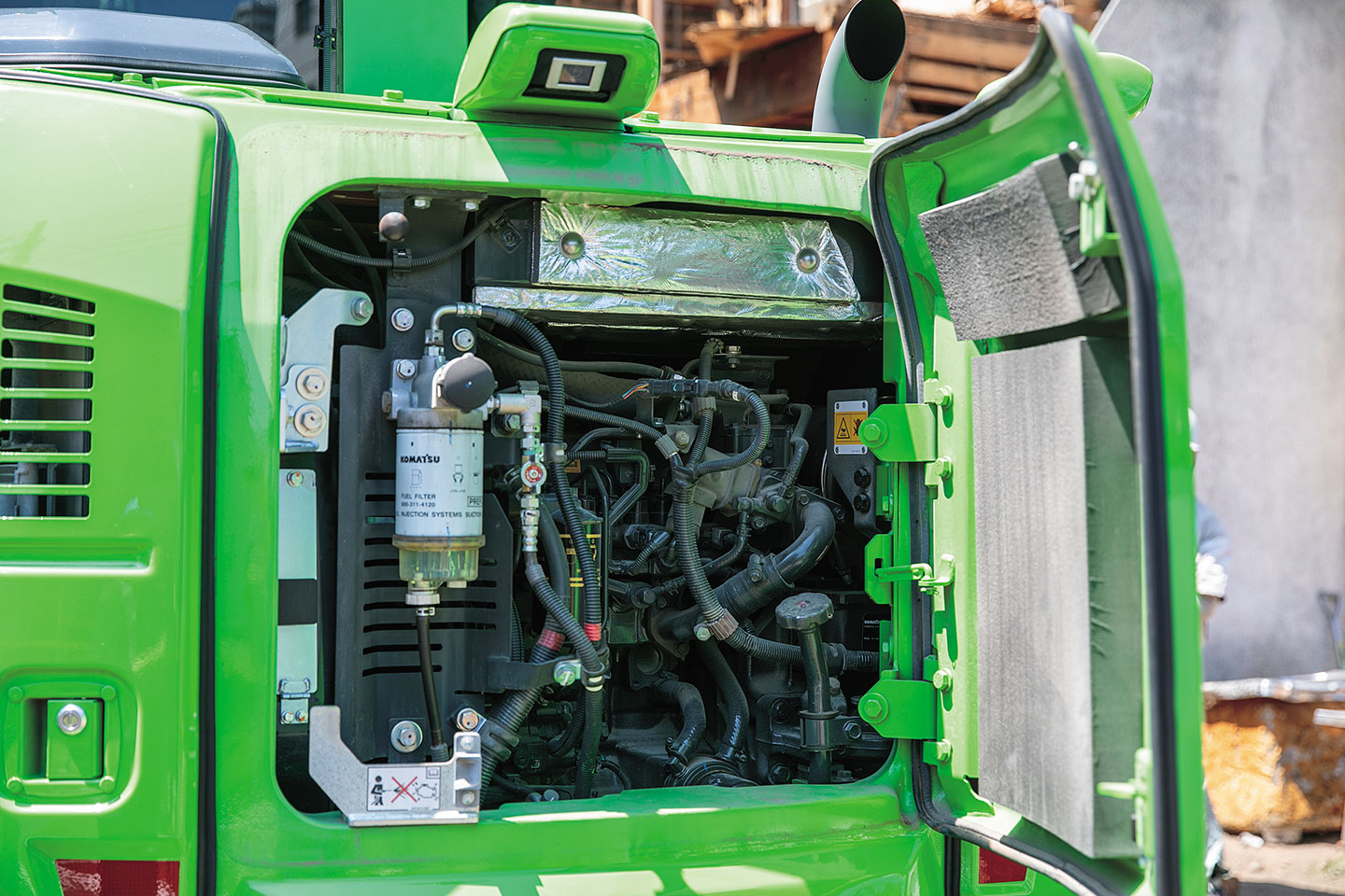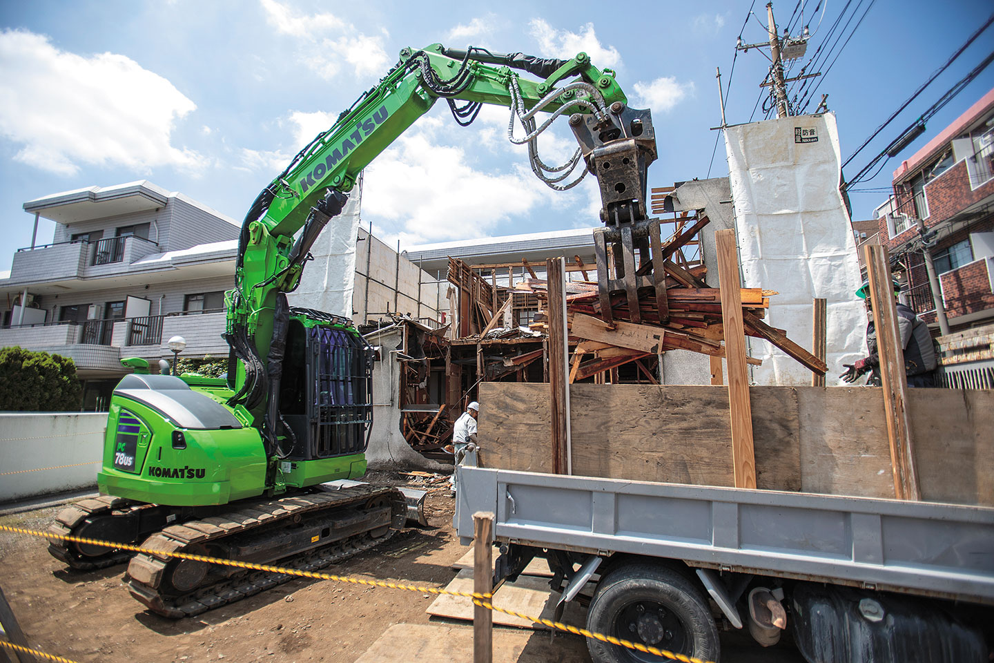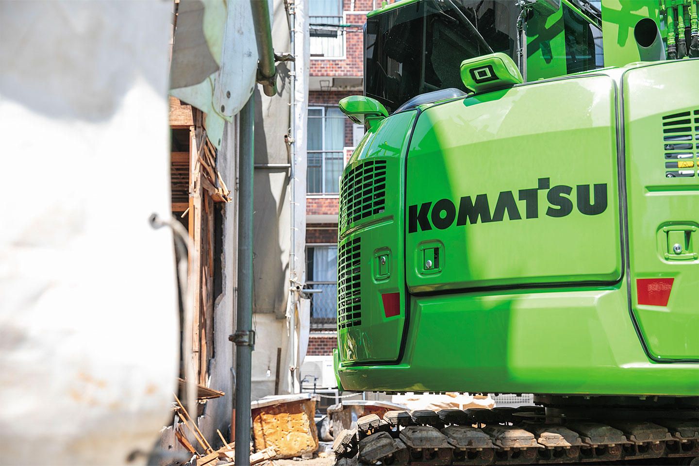 同社が手がける現場は、都内の住宅街の一軒家やアパートなど、二階建て木造住宅の解体が中心だ。周囲に建物が迫る狭小地での作業が多いため、建機には大きなスペースを必要としない小回り性能が強く求められる。そうした環境に対応するため、同社ではこれまでロングアームのPC78US-8解体仕様で解体業務を行っていた。その後、同業者より「ブームを分割構造としている2ピースブームは、狭いスペースでの解体作業に更に力を発揮する」との情報を入手。試乗を行ったうえで、その機能性を実感し、PC78US-11解体2ピースブーム仕様を購入した。