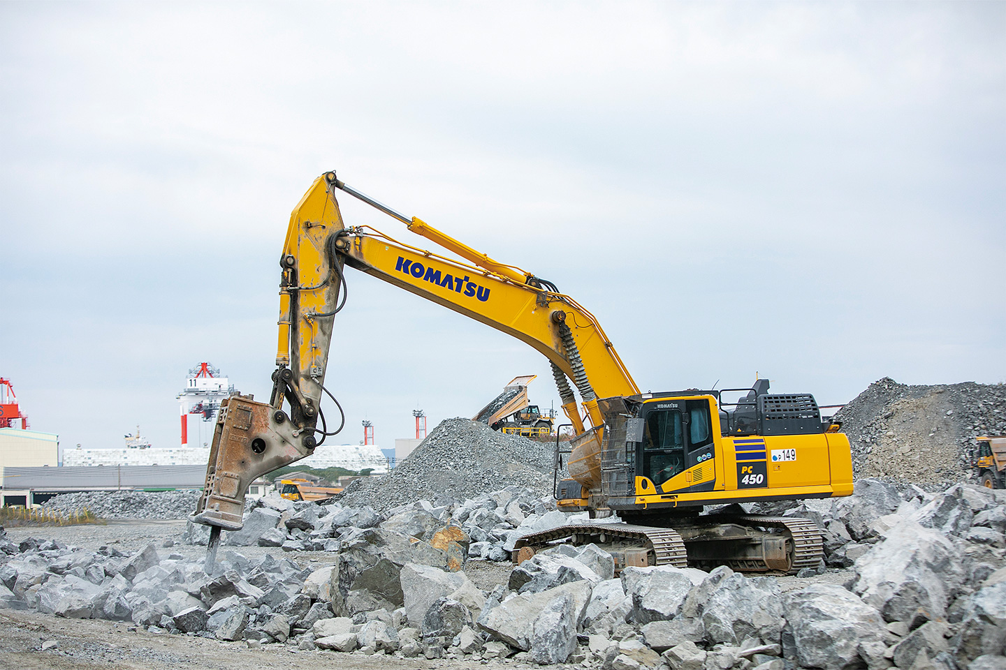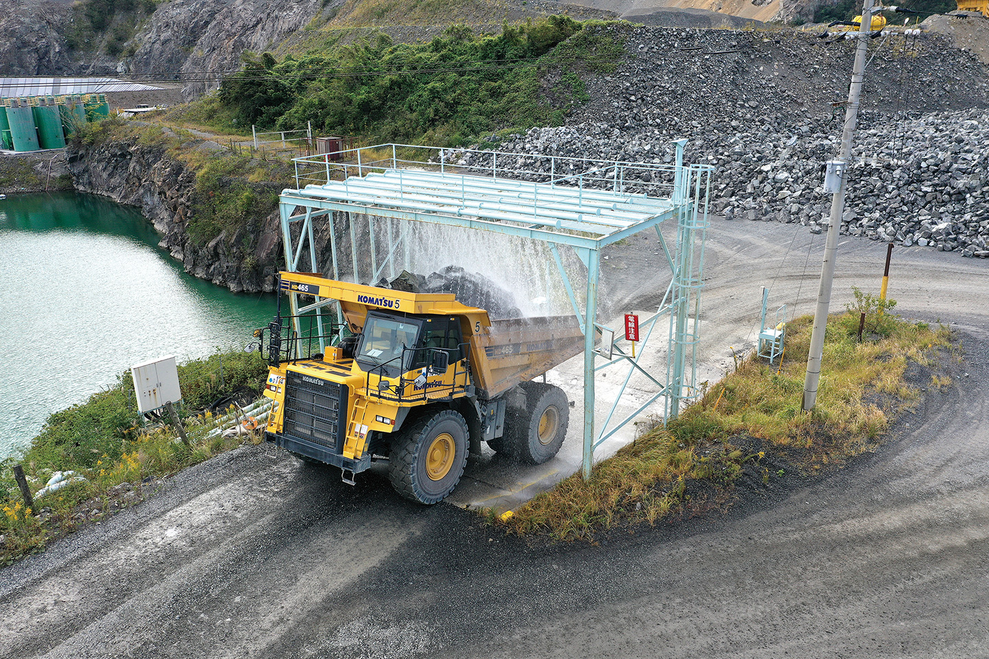同グループでは、環境保全や地域社会との共生にも積極的に取り組んでいる。環境保全に向けた取り組みの一例が独自の洗石システムだ。毎分15㎥を超える強力な水流で石材表面の細かな汚れを洗い落とす装置で、海中投入時の濁りを大幅に抑制する効果がある。そのほかにも採石現場の採石後の緑化や大型散水車による道路清掃など、環境負荷の低減に向けた対策を継続的に行っている。