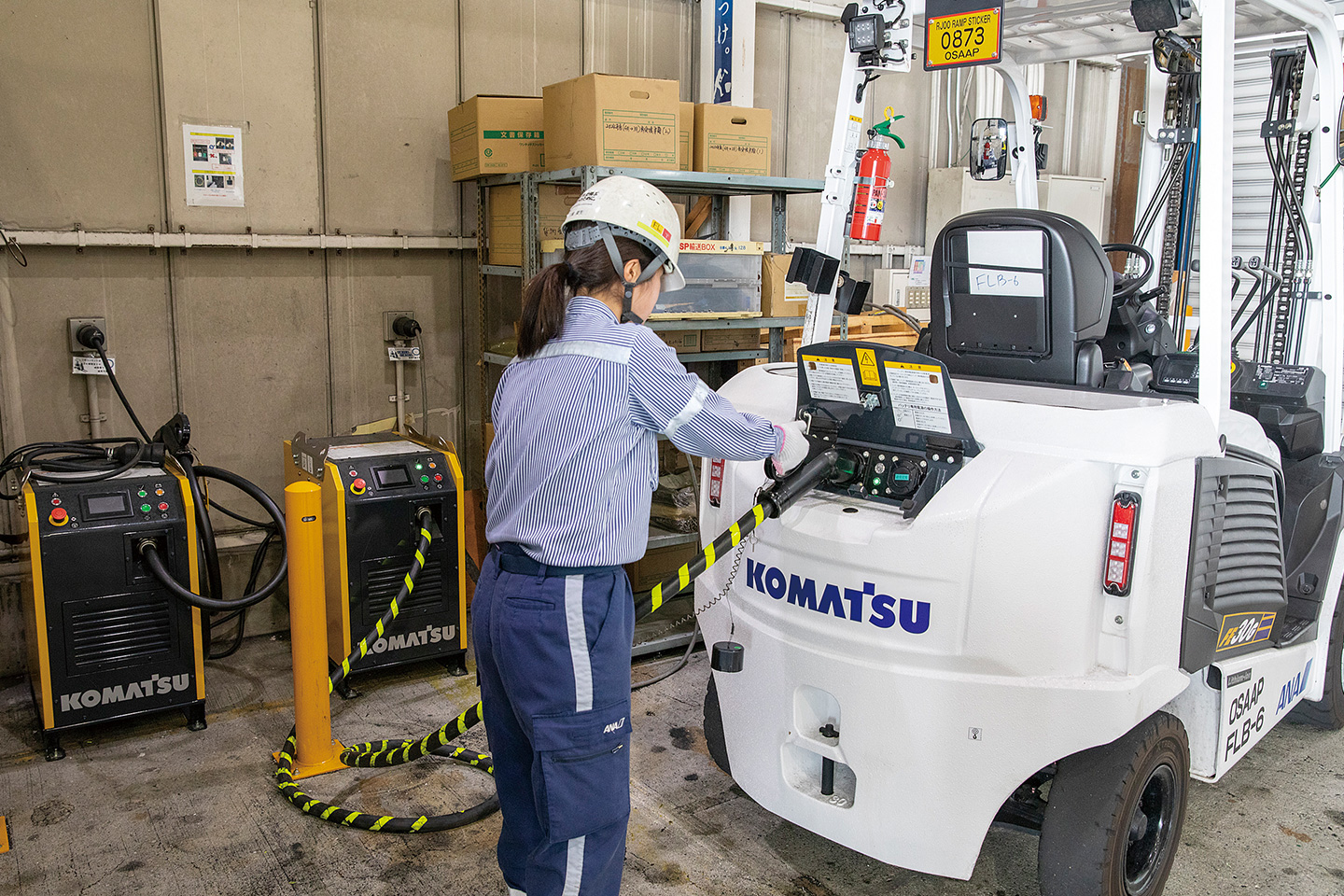 長年にわたり採用されてきたコマツのトーイングトラクターによる航空機の牽引作業