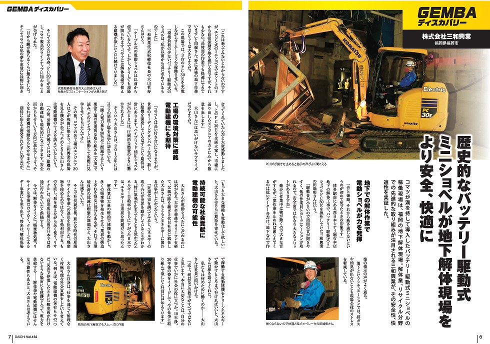 今後における自社の営業展開に絡め、「一つの施工会社ができるレベルの話ではないですが、コマツにお願いしたいことが一つあるとしたら、ぜひ現場でも使える騒音や排気ガスを出さない商品開発、すなわち技術革新を起こしてほしいと思っていますし、自動で施工できる機械の開発を是非、お願いしたいです。将来的には解体現場で無人の機械による施工というのも、必ずできる時代が来ると思います」と先を見据えながら訴える。