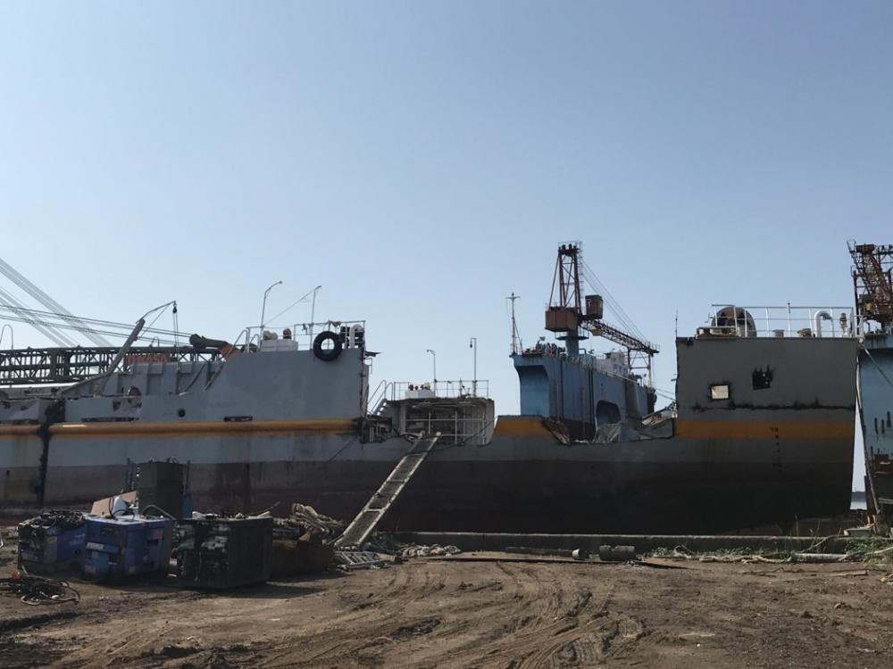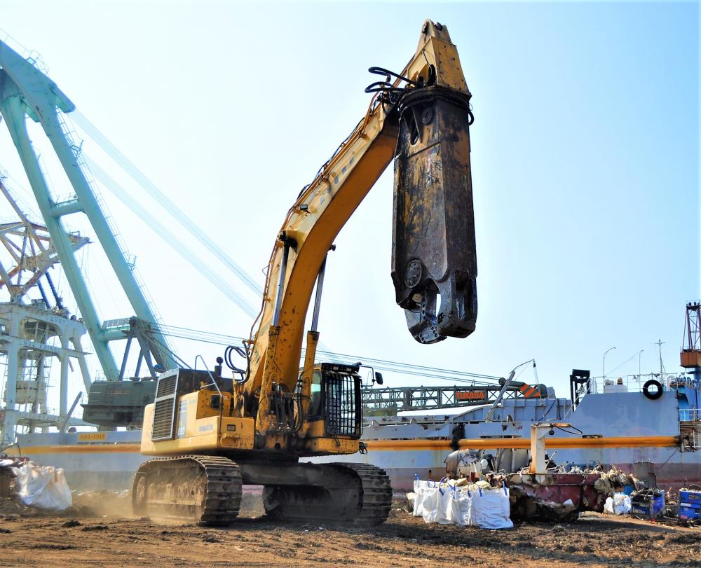 解体作業はまず船体の切断から始まる。分厚い船体の鉄板を切断するためには、人力でのガスバーナーによる切断作業か重機による切断の何れかの方法となる。同社が使用しているコマツPC850-8とMSD7500R ラバウンティの組み合わせなら、厚さ30mmオーバーの鉄板の切断も可能だ。そのためこれまで難しかった船体外板とそれらを支える骨組みの鋼材が重なる部分の切断も可能になり、解体作業がよりスピーディーに行えるようになった。その結果、船体形状などの条件によっては1日で50トンから70トンの鉄や鋼材を取り出せることも可能になったと話す。