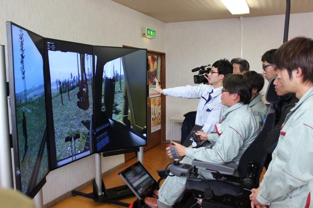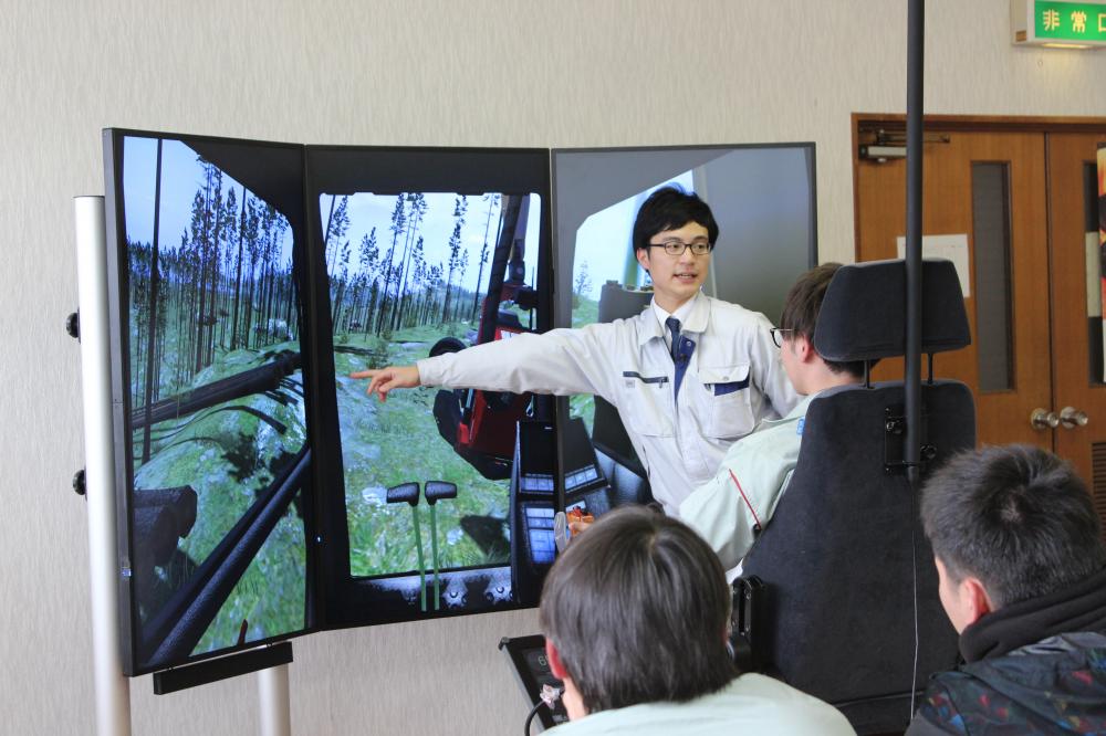 ―搭乗してみた感想を。 研修者 まず、目前の映像が非常にクリアで、本当の機械を運転しているような感覚がありました。頭の上にはカメラマンが付いており、私の動きとリンクして視界が変化したりと、さまざまな工夫が施されていることがわかりました。 ―操作は習得できましたか。 研修者 はい、数十分ほどの搭乗時間で基本的な操作はほぼマスターできたと感じています。もちろん実際現場で同様に操作ができるかどうかが重要ですが。しかし私は最近、油圧ショベルの講習を受けまして、その時にいきなり本物の重機に乗ることに若干の恐怖を覚えました。周囲に危険が及ばないかや、力の入れ具合などが不安でした。ですので、このようなシミュレーターで操作をあらかじめ体験しているかいないかでは、覚えるスピードに雲泥の差があるように感じます。とても効率よく学べるのではないでしょうか。 ―集団で研修が受けられる点については。 研修者 はじめは講師の方から操作を教えていただいて、頼りきりになっていましたが、操作を覚えた者が次第に増えてくると、仲間同士でアドバイスし合ったり、注意したりすることが多くなり、個人の技術を全体で共有できるようになりましたね。周りに体験者が多ければ多いほど、相乗効果を発揮して早く上達できるように感じます。 ―現場で作業を行うにあたっての抱負を。 研修者 このコマツのシミュレーターの経験をもとに実際のハーベスタを使って、高品質な木材の供給を県内はもとより世界へ広く発信したいですね。 ―ありがとうございました。