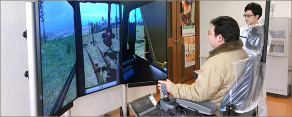 (写真:搭乗型VRシミュレーター「KF400」を操作する林業研修者)