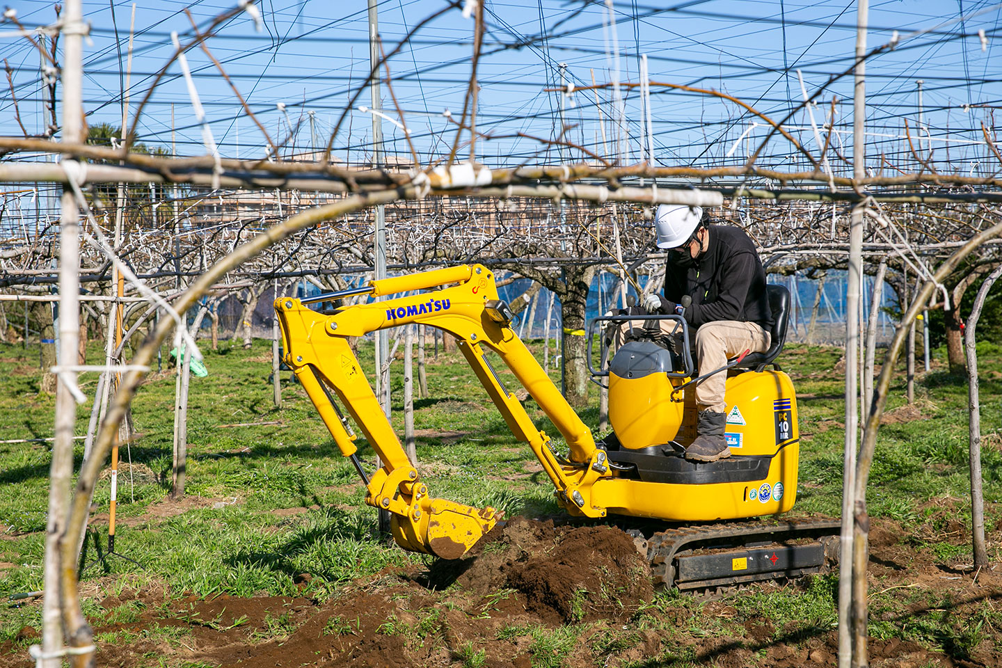 「まず、私達の梨組合で同じ車両を所有していたので なじみ深いという点がありました。そして梨の枝が張っている場所で使用するため、車高が低いという点や作業のしやすさや安全性を含めてこちらの車両に決定しました。」とPC10MR-2の導入理由を語る橋本哲弥代表。 さらに、梨組合でコマツの特別教育を受講された経験があり 、操作性も含めてなじみのあるコマツのミニショベルに決めたという。 梨園では夏に良質な梨を収穫するため1年を通じてさまざまな 作業を行うが、その一つに寿命を迎えつつある古い木を抜き、若い木を植えていく改植がある。古い木は土の中に深く多方向へ根を張り 、手作業ではかなりの重労働になるため、コマツのミニショベルで作業を行っている。さらに掘り起こした土の埋め戻しや敷均し、転圧など一連の作業にも利用し作業の省力化に一役買っている。梨の枝が張りめぐらされた低く狭い梨園では車高の低さ・サイズ・パワーのバランスからPC10MR-2が最適のようだ。