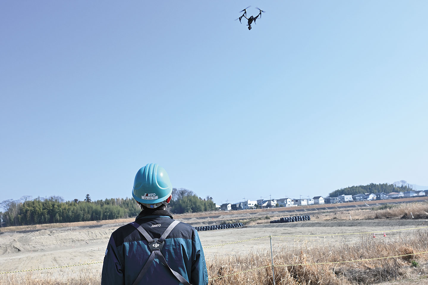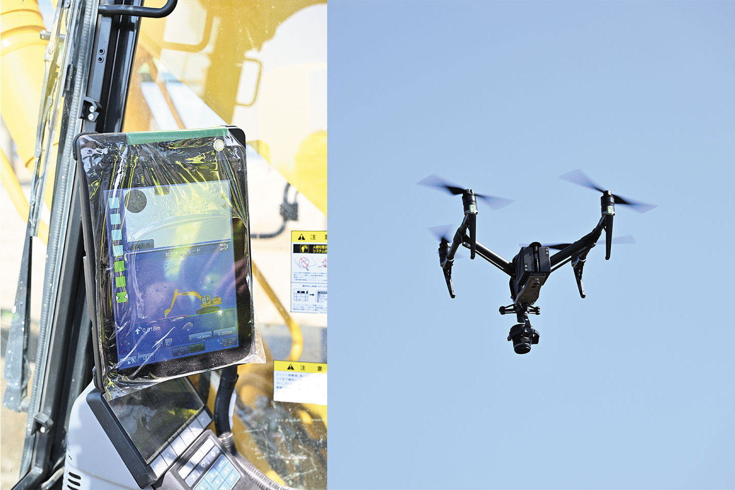 同社でのICT施工の導入は、ドローンによる空中写真測量を用いた出来形管理から始まった。従来は、測定基準にしたがって測定し図面に書かれている数値と比較するという、手間のかかる煩雑な作業を行う必要があった。それがドローン測定をすることで、スピーディーかつ楽になり、大きなコスト削減と短納期化を実現した。ICT施行の導入による高生産性を実感した同社は、ドローンによる3D測量、そして3D図面によるICT建機活用へと領域を広げていった。