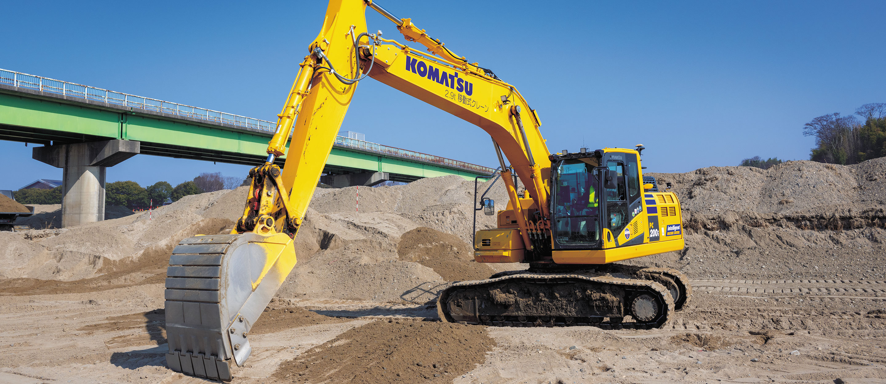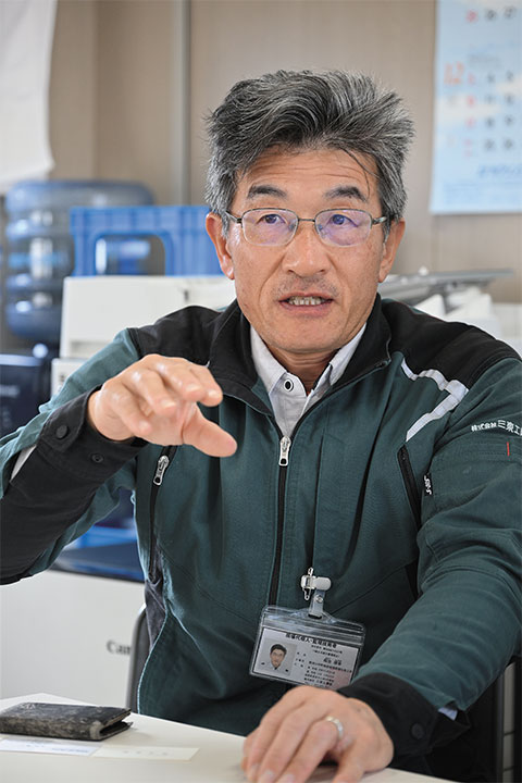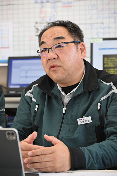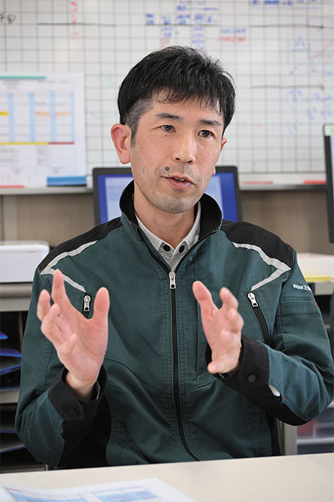 「従来は、朝から夕方にかけて1日中、2、3人でひたすら丁張り設置をしていました。特に河川の場合は石が多くあるため、杭が刺さらないこともよくありました。その作業がなくなったのは本当に大きいです」と、執行役員土木事業本部本部長の山本明登氏は語る。また、土木事業本部工事部工事長の岡治俊幸氏は「これまで事務的な業務は、現場終了後に事務所に戻り、残業時間に処理するしかありませんでした。業務時間が短縮したことで有効活用できる新しい時間が生まれ、残業時間削減につながっています」と、ICT施工のメリットを説明する。また、従来は手元作業員として1、2名が建機周辺で作業を行っていた。工事現場には土砂を運搬するダンプカーが1日に延べ100台以上往来する。それぞれが高い安全意識で業務を行っているが、どうしても作業には危険が伴う。ところがICT施工を導入すれば手元作業員が必要ないため、安全性が大きく向上した。