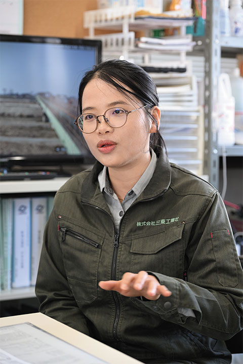 同社ではICT業務を推進するうえで、効率的でスムーズな導入を図るために、専門の部署となる「システム管理室」を設けた。「社内の情報システムに関することはここで集中的に管理しています。さまざまな情報をタイムリーに収集して社内のシステムに活かすとともに、効率的な情報共有を行っています」と、管理本部システム管理室室長の松岡宏治氏は語る。図面の3D化を一手に引き受けているのが土木事業本部工務部ICT担当のホアン・トゥ・フエン氏だ。フエン氏はベトナムの国立ハノイ水利(トゥイロイ)大学で建設を学び、日本での就職を希望し、卒業とともに同社に大学新卒者として入社した。「大学で建設に関することを一通り学習しましたが、図面の3D化などICTに関することはほぼ日本で学びました。技術は日々進化しているので、常にアンテナを張って、最新の情報を吸収してスキルアップをしていきたいです。今後は、現場に出て経験値を高めたいです」と、フエン氏は展望を語る。