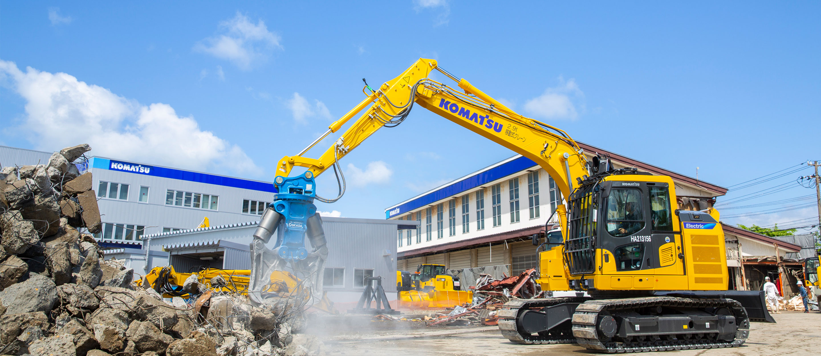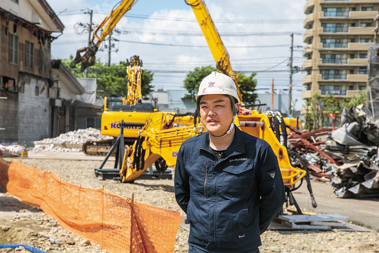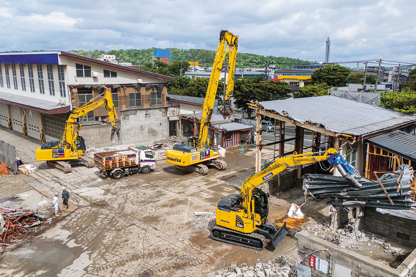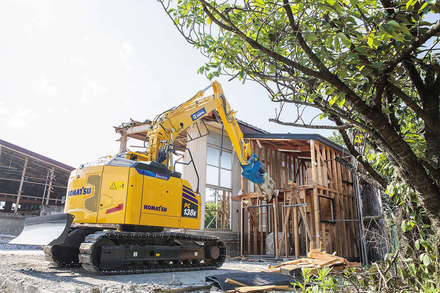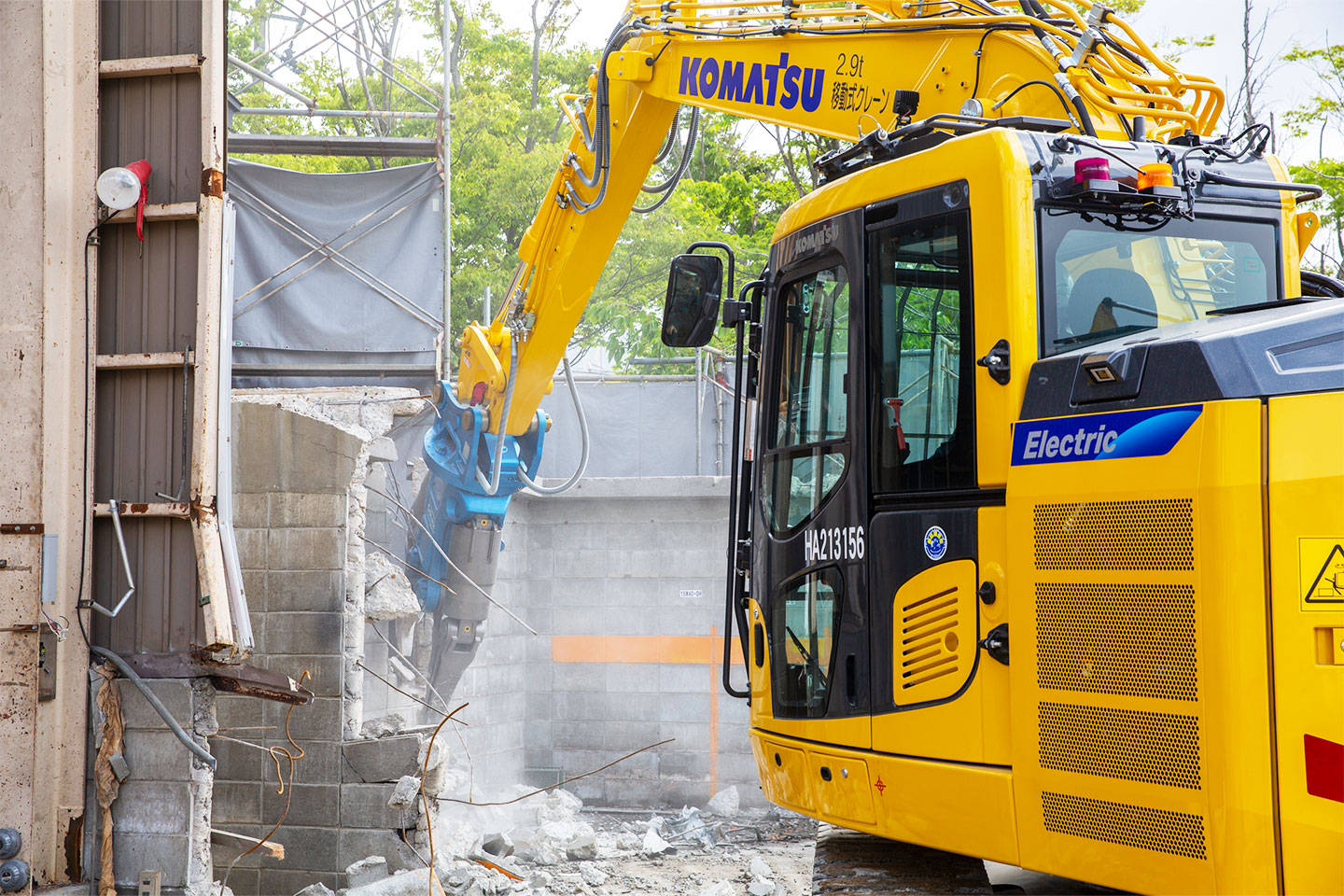 PC138E-11は機体が小さく、しかも小回りが利くため、他の建機の近くで作業する際にも妨げになることがなく、スムーズで効率的な業務を実現する。また、30tクラスの建機が入らない小規模な建物の解体にも有効だ。「電動式ショベルはパワー不足ではないかと心配していましたが、実際乗ってみるとそんなことはありませんでした。エンジン駆動式と比べてもパワーに遜色はなく、効率的に作業ができます。また、振動が少なくていいですね。エンジン駆動式だと振動があるため長時間乗ると体への負担が大きいですが、PC138E-11なら長時間快適に作業できます」と、工務班の湊健氏は電動式ショベルのメリットを語る。