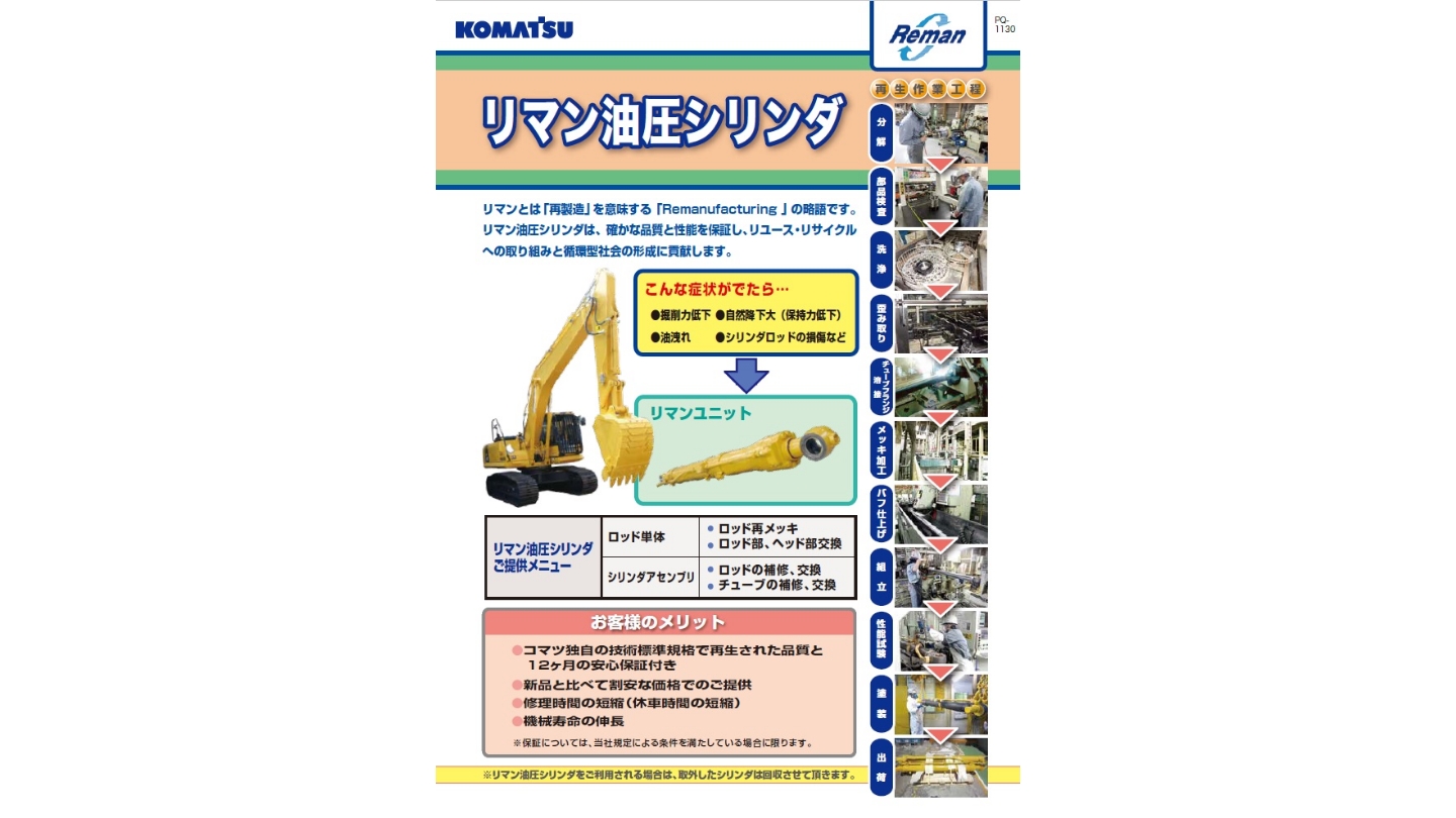 リマンとは「再製造」を意味する「Remanufacturing 」の略語です。リマン油圧シリンダーは、確かな品質と性能を保証し、リユース・リサイクルへの取り組みと循環型社会の形成に貢献します。