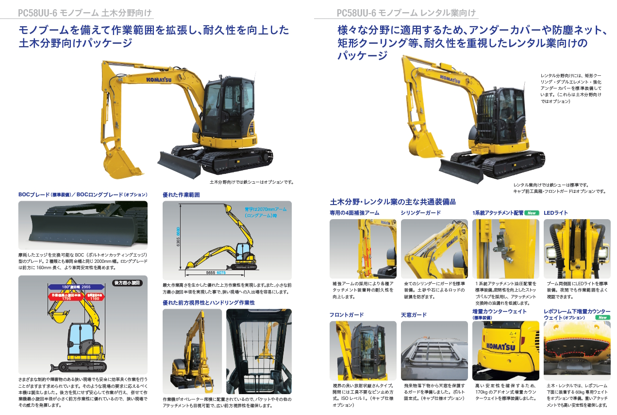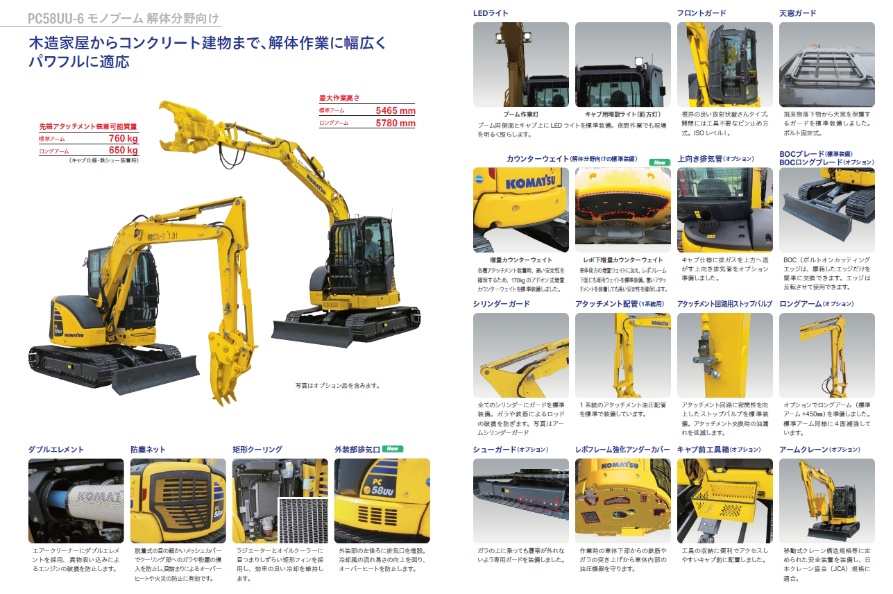 - 主なオプション:林業用車体ガード、4面補強ロングアーム、ボルトカッティングエッジロングブレード、キャブ前工具箱