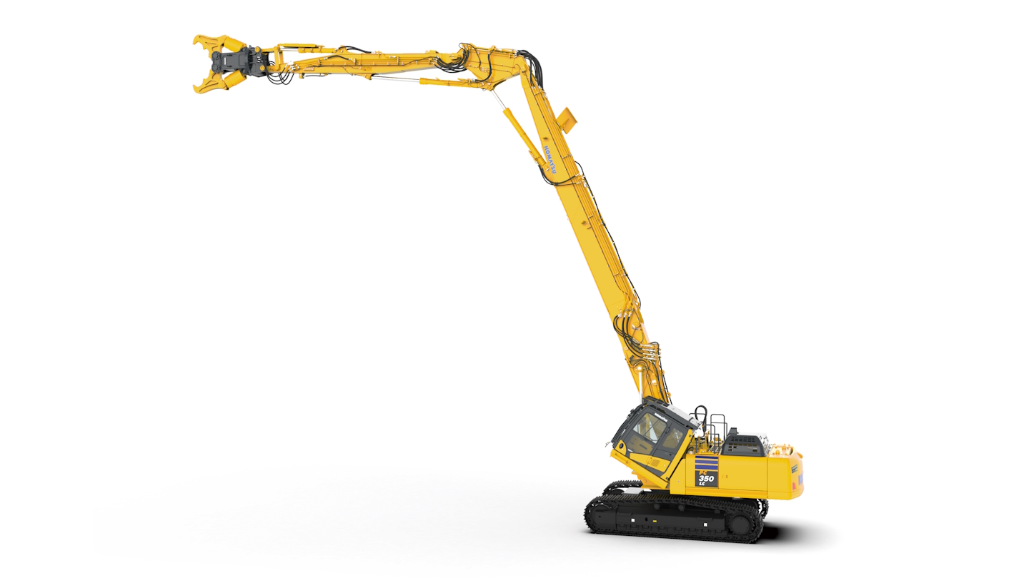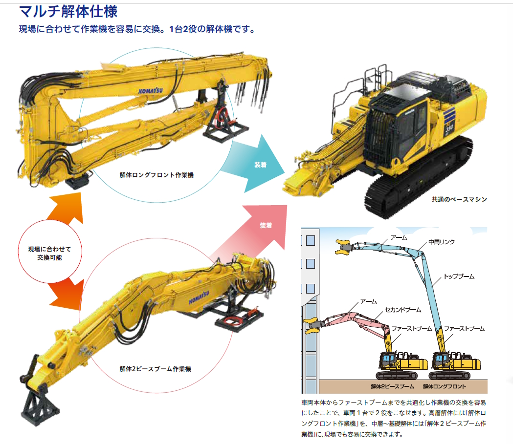 - 高層解体には「解体ロングフロント作業機」を、中層~基礎解体には「解体2ピースブーム作業機」に、現場でも容易に交換できます。