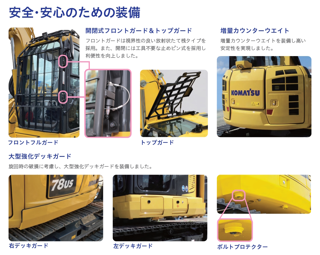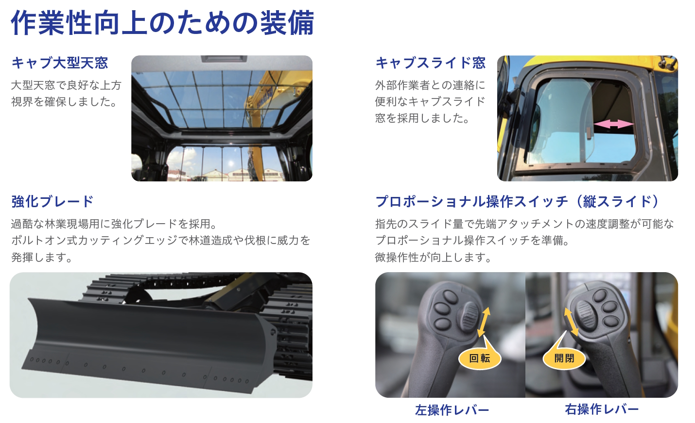 車体保護ガード、作業機配管カバー、大型チェーンソーBox、ウィンドウォッシャー付天窓ワイパー、フルローラーガード、ツバ付上転輪、リバーシブルファン、フル流量サービスバルブ、ハーフ流量サービスバルブ 等