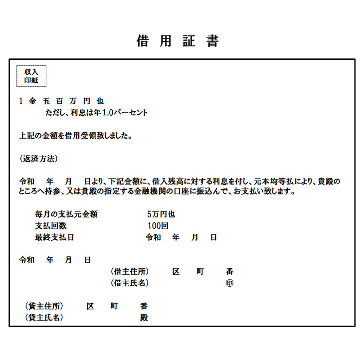 要するに「第三者」に金銭を貸し付けたと同様に考えて、「借用証書」を息子さんより入手して、きちんと返済の事実を証拠資料として遺しておくことが重要です。簡単な「借用証書」の様式例を示しておきますので、参考にしてください。