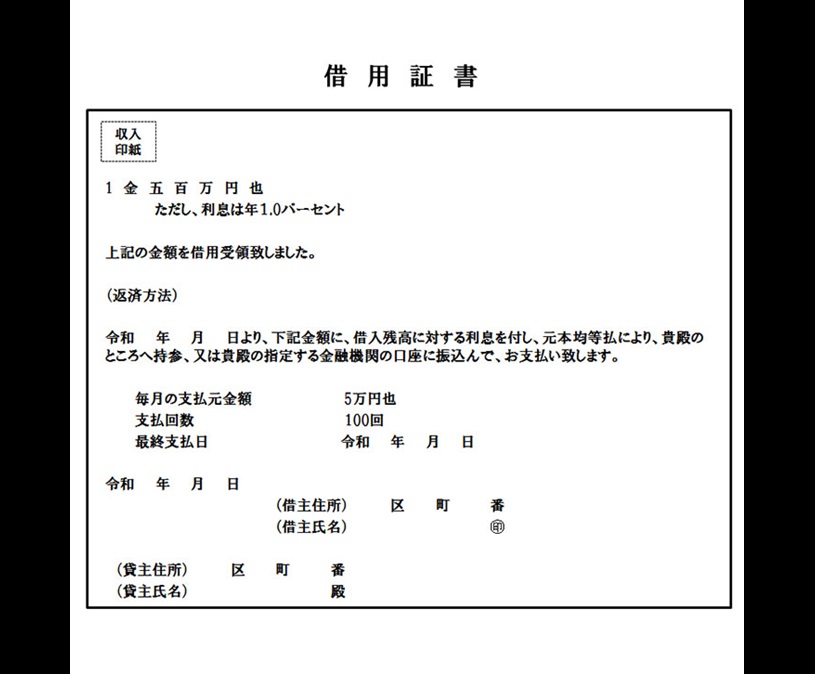 『借用証書』又は『金銭消費貸借契約書』の様式はいろいろあります。日本法令様式やインターネットでも確認できますが、が、比較的に簡略化した様式をご紹介いたします。