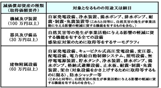 中小企業防災・減災投資促進税制は、「事業継続力強化計画」の認定を受けた中小企業者が、自然災害への事前対策を強化するために、一定の設備投資を特別償却を認める制度です。 令和5年度税制改正では、対象設備に「耐震設備」が追加され、特別償却率を18%(令和7年4月以降に取得等をする場合は16%)とした上で、適用期限が令和7年3月31日まで2年間延長されました。 なお、本税制の対象設備は次の通りです。