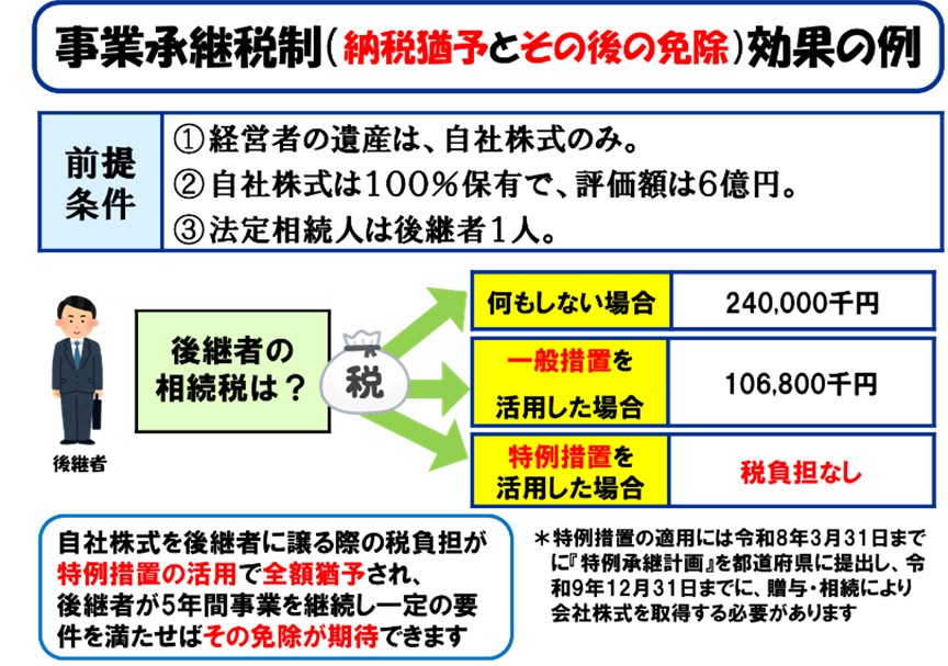 事業承継税制は、「節税」ではなく、「納税猶予及びその後の免除」制度です。したがって、この税制を使用してすぐに節税できるわけではありません。また事業承継税制には、恒久的な措置である「一般措置」と、令和9年12月31日まで適用できる「特例措置」があります。一般論としての効果を示してみます。